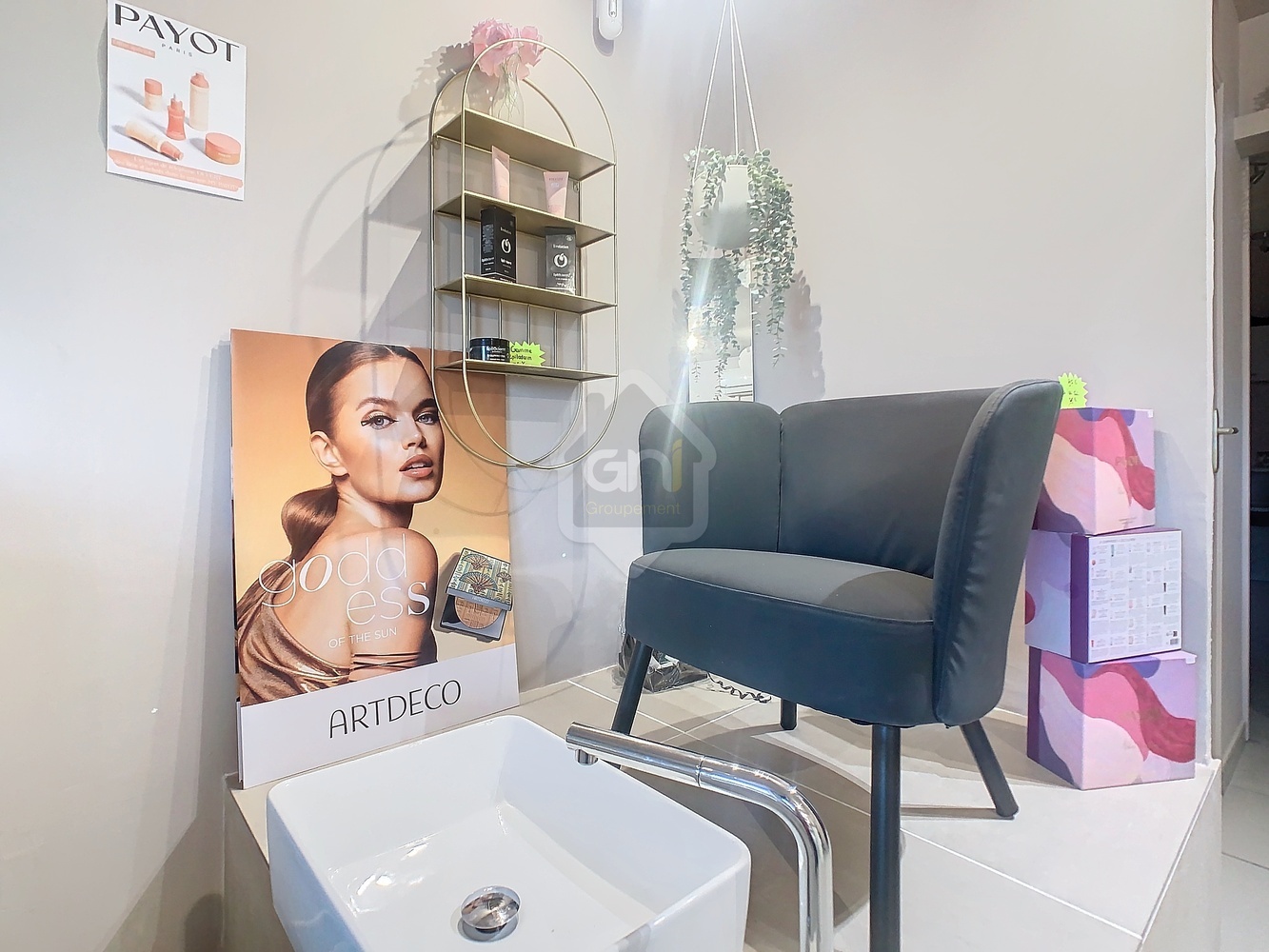 Il est composé d'un espace d'accueil / vente / soin pieds et mains, d'une cabine massage, d'un hammam, d'une cabine soin visage et d'un étage pour du stockage.
