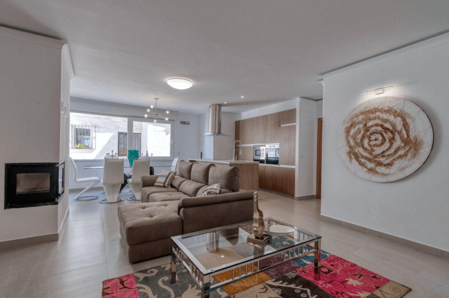 L'espace de vie ouvert est lumineux et bien agencé. La cuisine de style américain, équipée de meubles en bois clair et de tous les électroménagers nécessaires, s'intègre harmonieusement à la pièce à vivre. Elle donne sur une grande salle à manger avec table intégrée, et un salon raffiné où une cheminée fonctionnelle apporte chaleur et convivialité pendant les mois d'hiver.