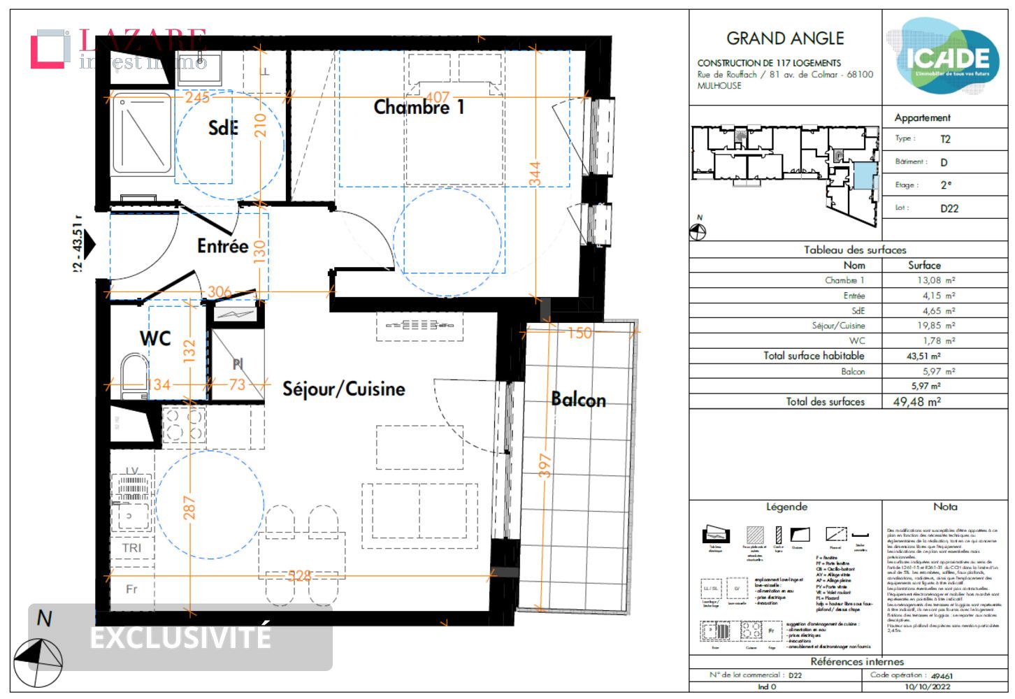 Au sein de la Résidence GRAND ANGLE, neuve et sécurisée avec ascenseur et aux prestations de qualité, retrouvez ce bel appartement T2 de 43,51 m2 au 2ème étage du bâtiment D avec un balcon de 5,97 m2 dans le prolongement du séjour et exposé Est.