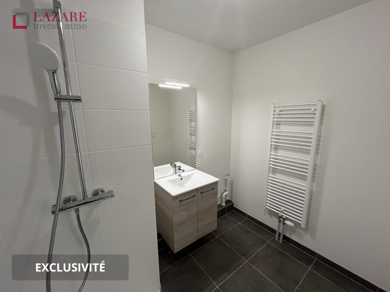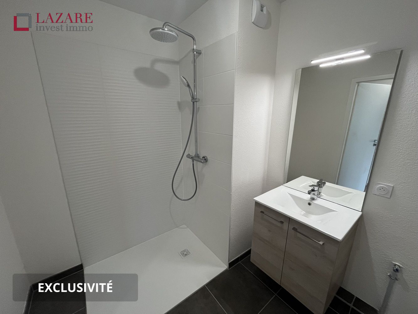 T2 composé d' une entrée, d'un séjour avec un placard, d'une cuisine ouverte aménagée et équipée ( plaque vitrocéramique 2 feux, évier avec égouttoir + mitigeur, pan de travail et crédence, hotte, meubles bas et hauts, emplacements pour appareils électroménagers, branchements LV ), d'une chambre avec placard, d'une salle d’eau ( receveur de douche, compris douchette et flexible sur barre, meuble vasque et vasque avec robinetterie, miroir avec éclairage, radiateur sèche serviettes, alimentation et évacuation en attente pour LL ) et d' un WC séparé .