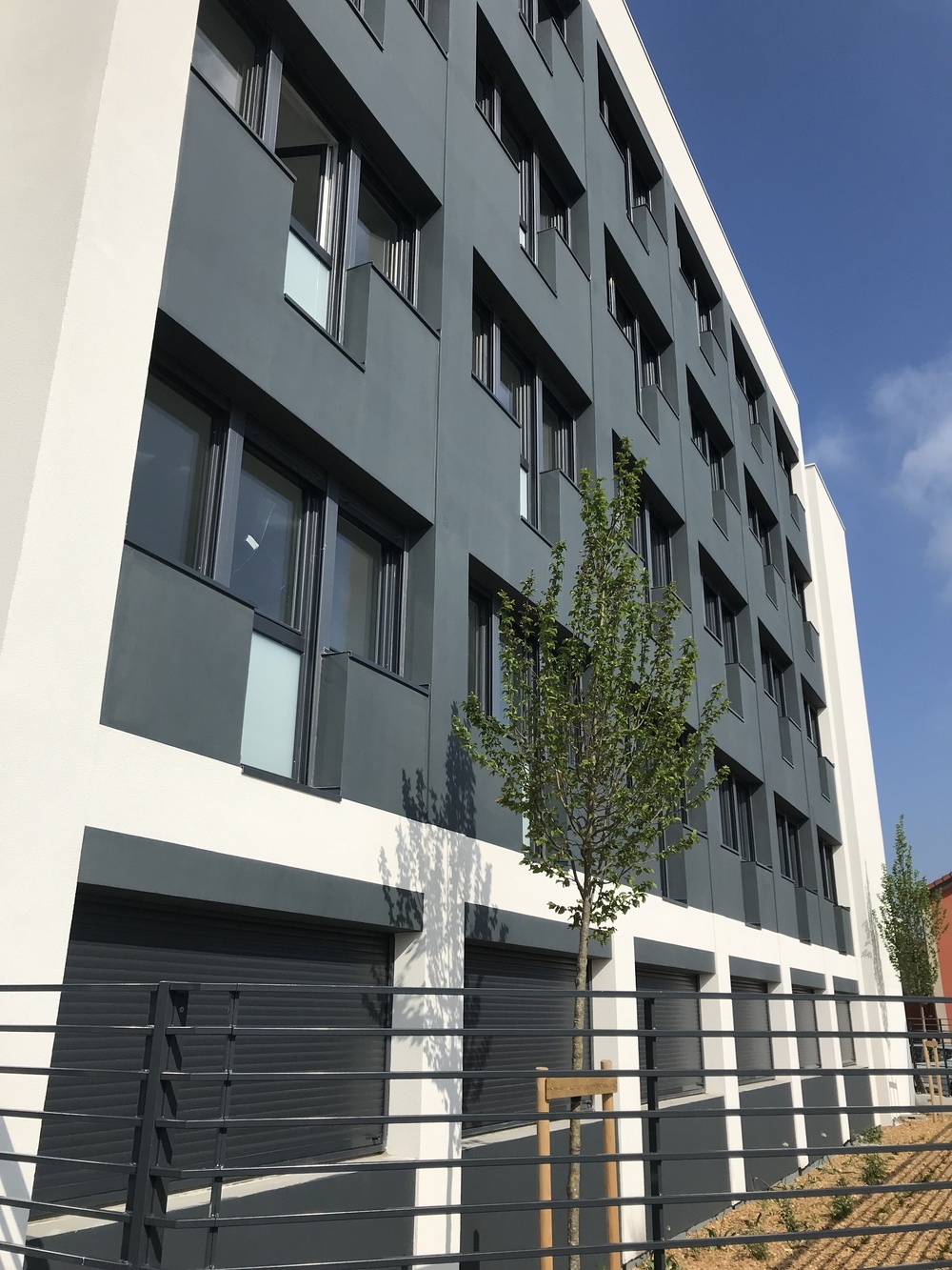 Façades élégantes avec des enduits gris contrastés et des garde-corps en verre dépoli pour une allure moderne et épurée 🏢