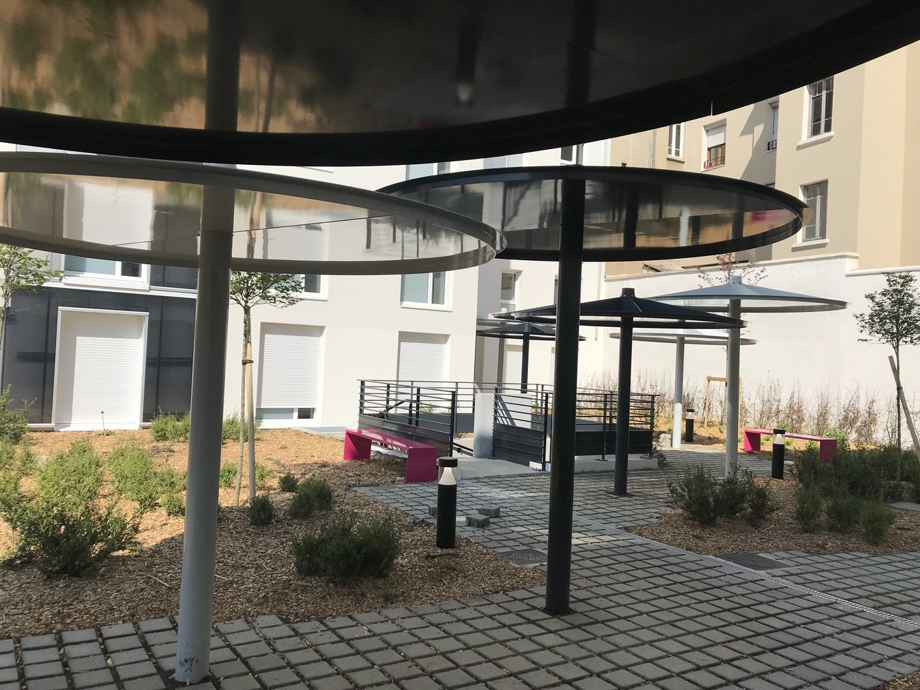 Jardin commun en cœur d’îlot, avec des arbres de hautes tiges et des parasols métalliques 🌳☂️