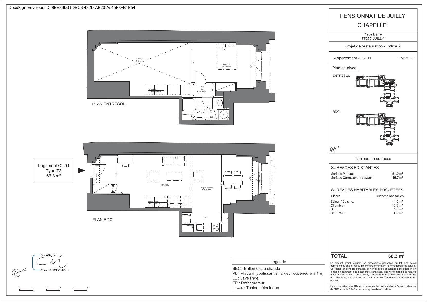 Au RDC, un 2 pièces en duplex de 66.30m² comprenant, un séjour avec une cuisine aménagée et équipée, une chambre, une salle d'eau avec wc.
