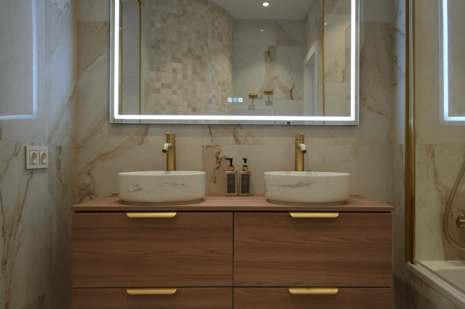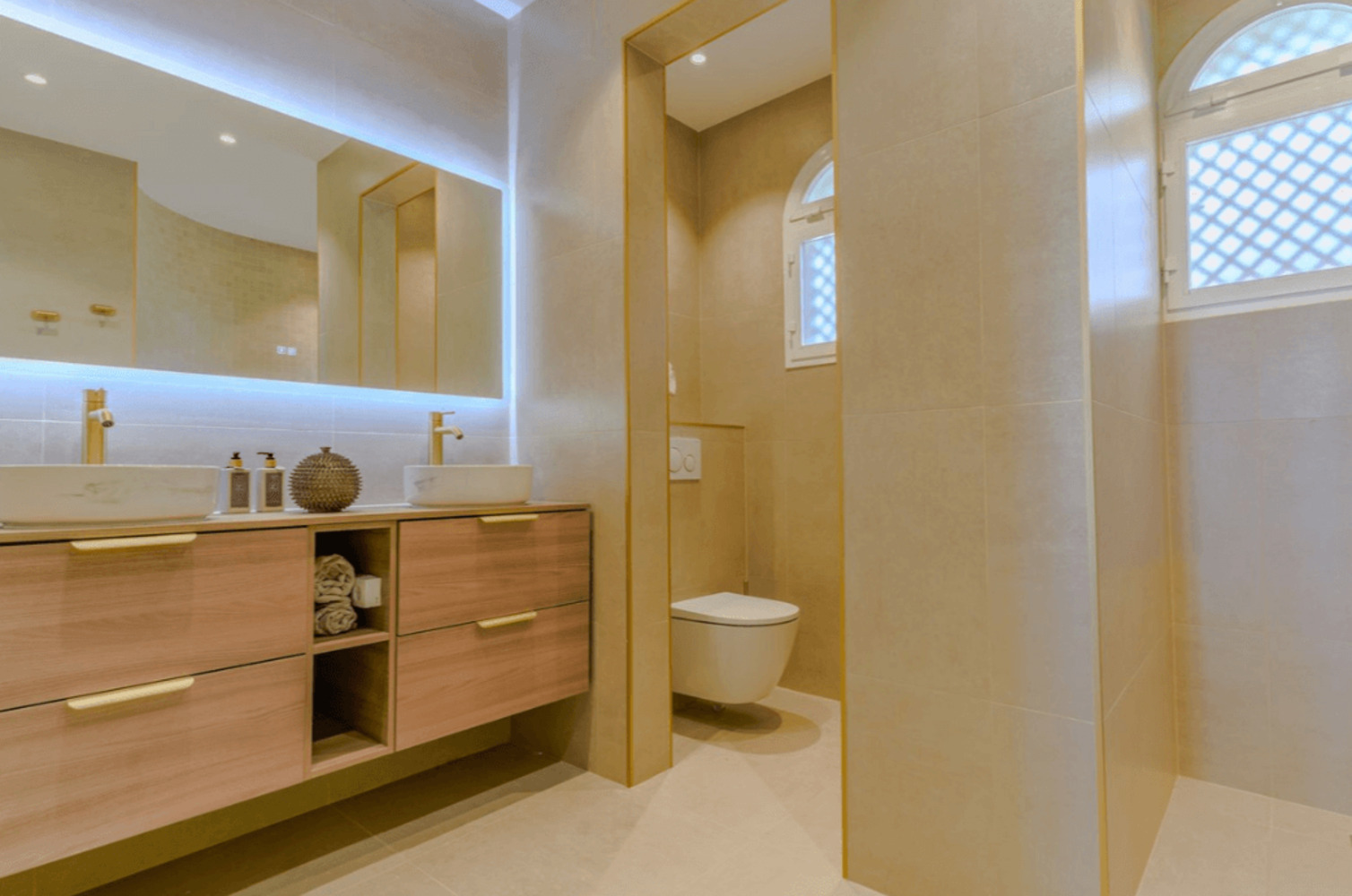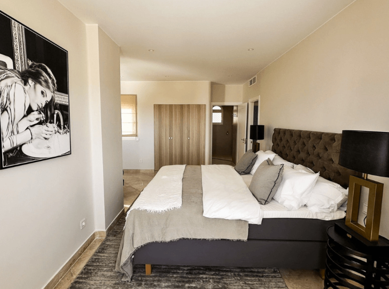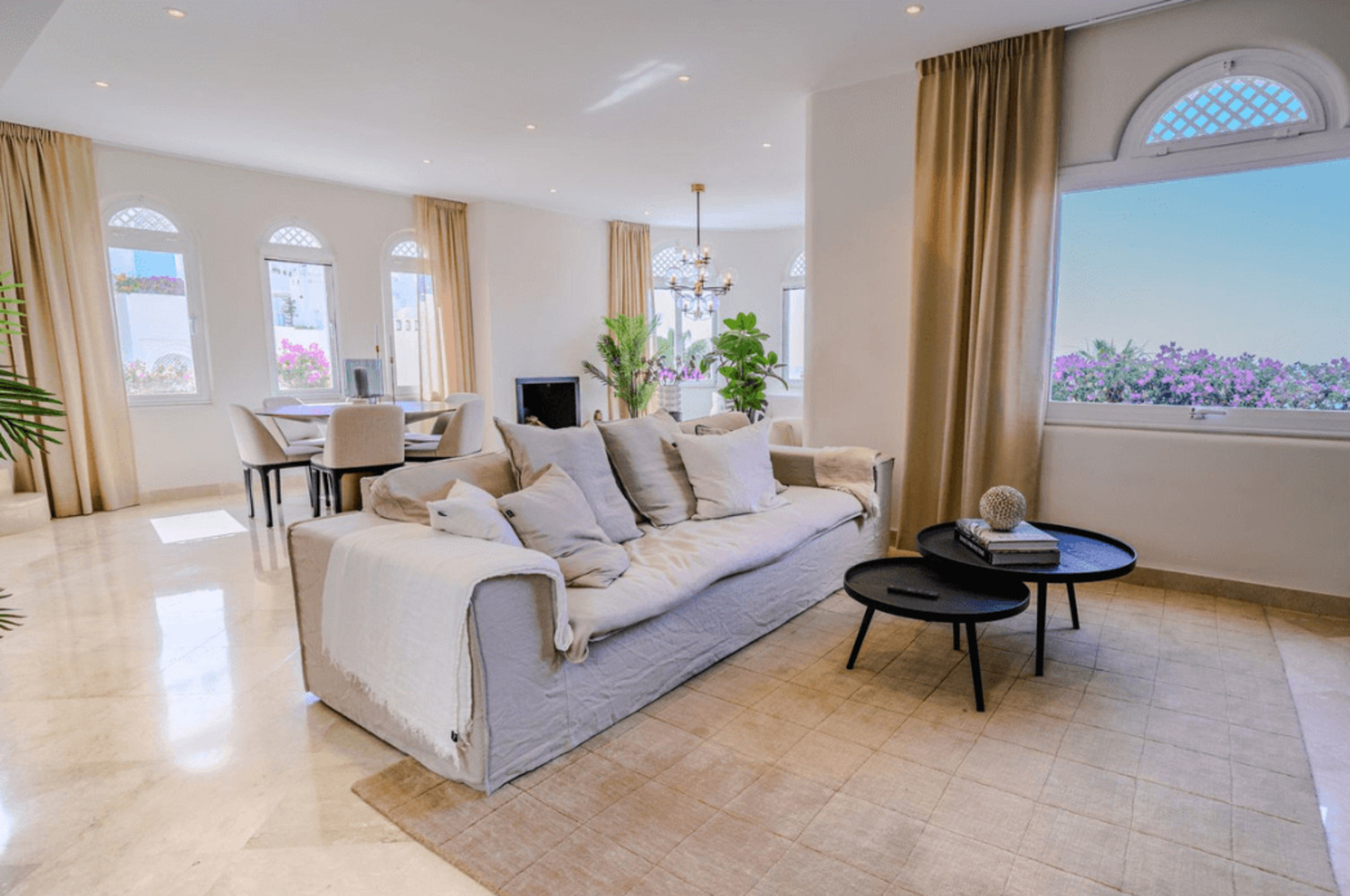 L’entrée s’ouvre sur une cuisine ouverte haut de gamme, parfaitement intégrée au salon et à la salle à manger, créant une atmosphère conviviale et lumineuse. Le niveau principal accueille la suite parentale et une chambre avec salle de bains privative, toutes deux offrant intimité et confort. L’appartement est entièrement meublé, avec des sols en marbre qui apportent une touche d’élégance.