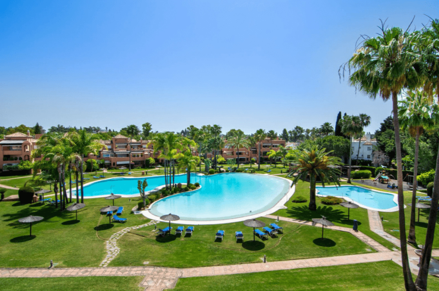 La résidence "Alhambra del Golf", construite en 1998, se distingue par ses vastes jardins luxuriants, ses espaces communs soignés et sa piscine de style lagon, considérée comme la plus grande de Marbella. L’appartement bénéficie d’un parking souterrain sécurisé et d’un local de rangement. L’accès se fait par des escaliers extérieurs, car il n’y a pas d’ascenseur dans cette partie du complexe.