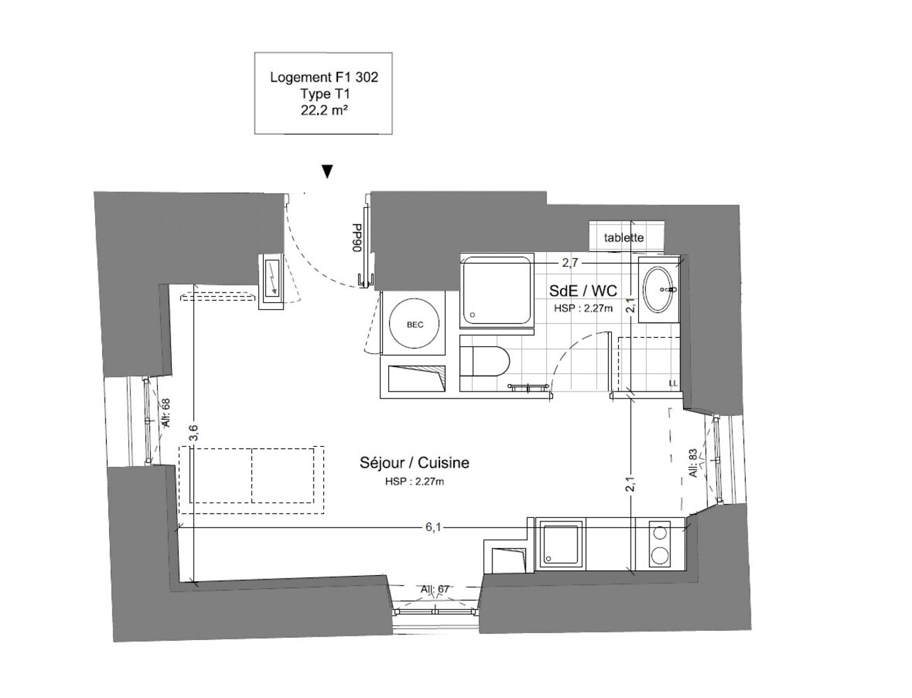 Un appartement de type Studio d'une surface de 22.20m² situé au 3éme étage.