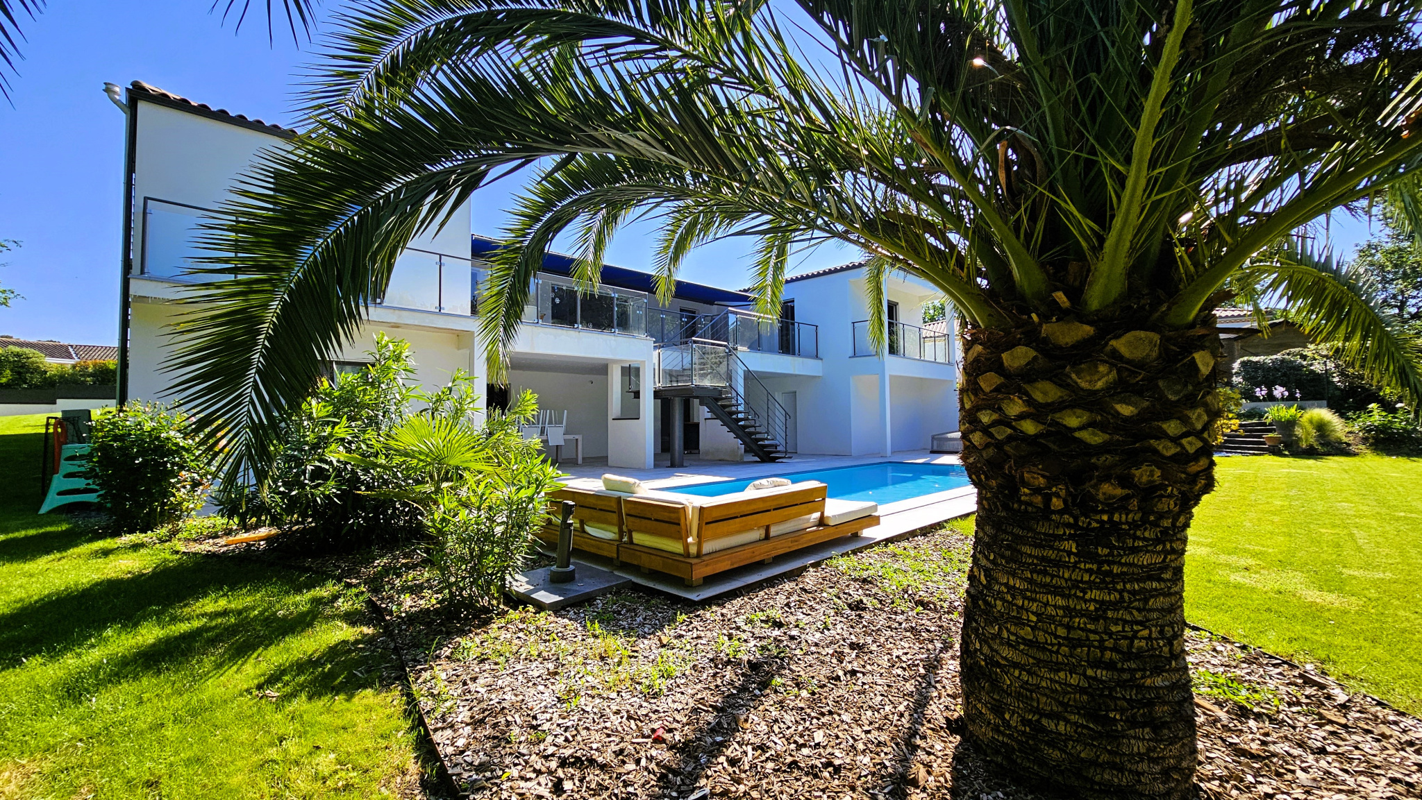 Nich�e au coeur d'un environnement bois� pris�, � seulement 1000 m�tres du centre des Mathes, cette villa contemporaine construite en 2021 s�duit par son architecture �l�gante et ses volumes g�n�reux.<br>D�s l'entr�e, vous serez charm� par la pi�ce de vie baign�e de lumi�re naturelle gr�ce � son plafond cath�drale et ses larges ouvertures sur l'ext�rieur. D'une surface d'environ 70 m2, cet espace s'ouvre sur une vaste terrasse sur�lev�e offrant une vue d�gag�e sur le jardin paysager et la piscine 8x4 avec son d�me coulissant t�l�scopique, id�ale pour en profiter pleinement toute l'ann�e.<br>Parfaitement pens�e pour accueillir famille et amis, la maison propose 5 chambres, dont une suite parentale avec dressing, salle d'eau, WC et un acc�s direct � une terrasse priv�e ainsi qu'� la terrasse principale de l'�tage. Un bureau et une buanderie compl�te ce espace.<br>En rez-de-jardin, une grande salle de jeux et un vaste espace de 72 m2 laissent libre cours � vos envies : salle de sport, home cin�ma, cuisine d'�t�... avec un acc�s direct � une seconde terrasse bordant la piscine.<br>Prestations haut de gamme : chauffage au sol par pompe � chaleur, climatisation r�versible, volets motoris�s, moustiquaires, adoucisseur d'eau, local technique.<br>Un garage et 4 places de stationnement ext�rieures compl�tent ce bien d'exception. Visite immersive sur demande.<br> Pour toute information compl�mentaire et rendez-vous de visite, nous vous invitons � prendre contact avec l'AGENCE CHARTREUX IMMOBILIER, sp�cialiste des BIENS DE CARACTERE sur le PAYS ROYANNAIS au 05 46 38 30 30 ou par courriel : contact@chartreux-immobilier.com<br>