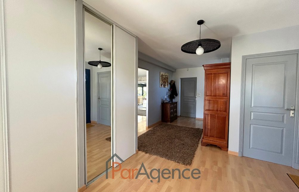 VAUX SUR MER - 500 M CENTRE VILLE, dans un secteur calme, édifiée sur un beau terrain clos et arboré sans vis à vis de 1014m2 avec piscine, cette maison d'architecte en parfait état de 184m2 utiles environ comprend: hall d'entrée avec placard, séjour ouvrant sur terrasse avec stores électriques, jardin et véranda, cuisine équipée ouvrant sur terrasse, chambre ou dressing, chambre avec placard ouvrant sur terrasse, salle de bains avec baignoire balnéo, douche et wc. A l'étage: palier desservant trois chambres avec placard, salle d'eau, wc. Chauffage au gaz de ville + climatisation réversible. Garage double de 40m2 avec galta. Piscine chauffée de 10m par 5m. Nombreuses prestations. Les informations sur les risques auxquels ce bien est exposé sont disponibles sur le site Géorisques : www.georisques.gouv.fr. Honoraires agence à la charge du vendeur. https://www.par-agence.fr/nos-honoraires.