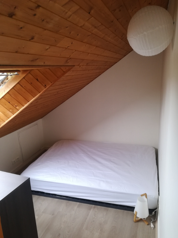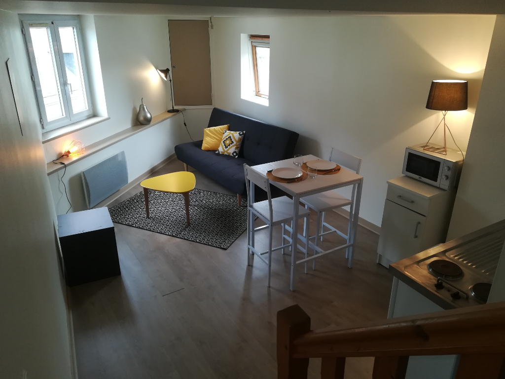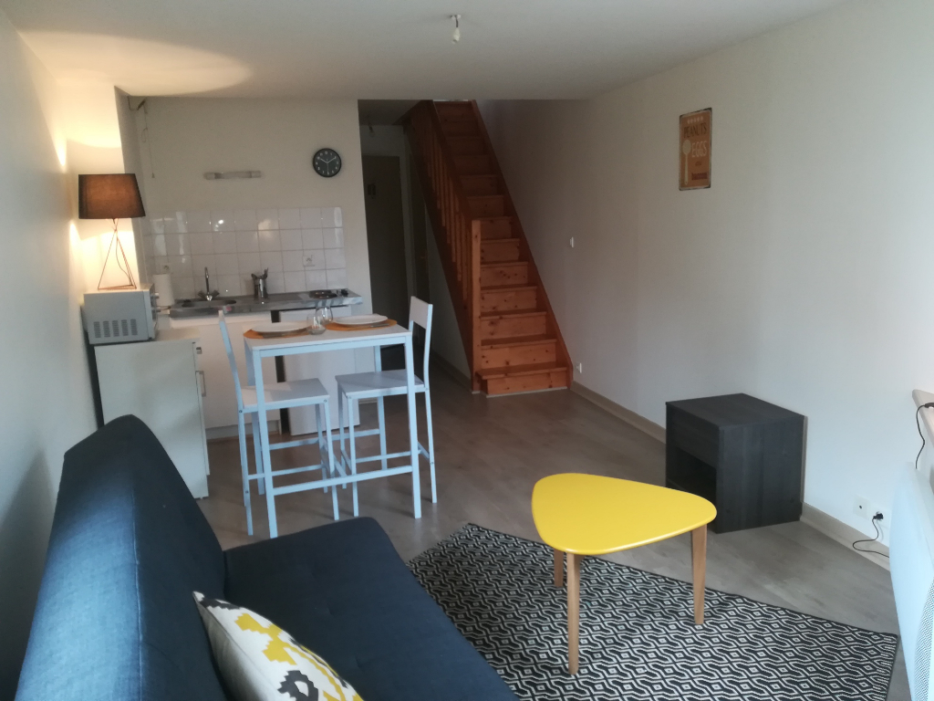 FOUGERES : Appartement MEUBLE T1 BIS en duplex comprenant une entrée, un coin cuisine équipée (frigidaire-plaques-micro-onde) ouverte sur pièce de vie, une salle d'eau avec wc. En mezzanine, coin nuit. Disponible - chauffage électrique COGIR IMMOBILIER FOUGERES : 5 boulevard Leclerc 02-99-99-20-90