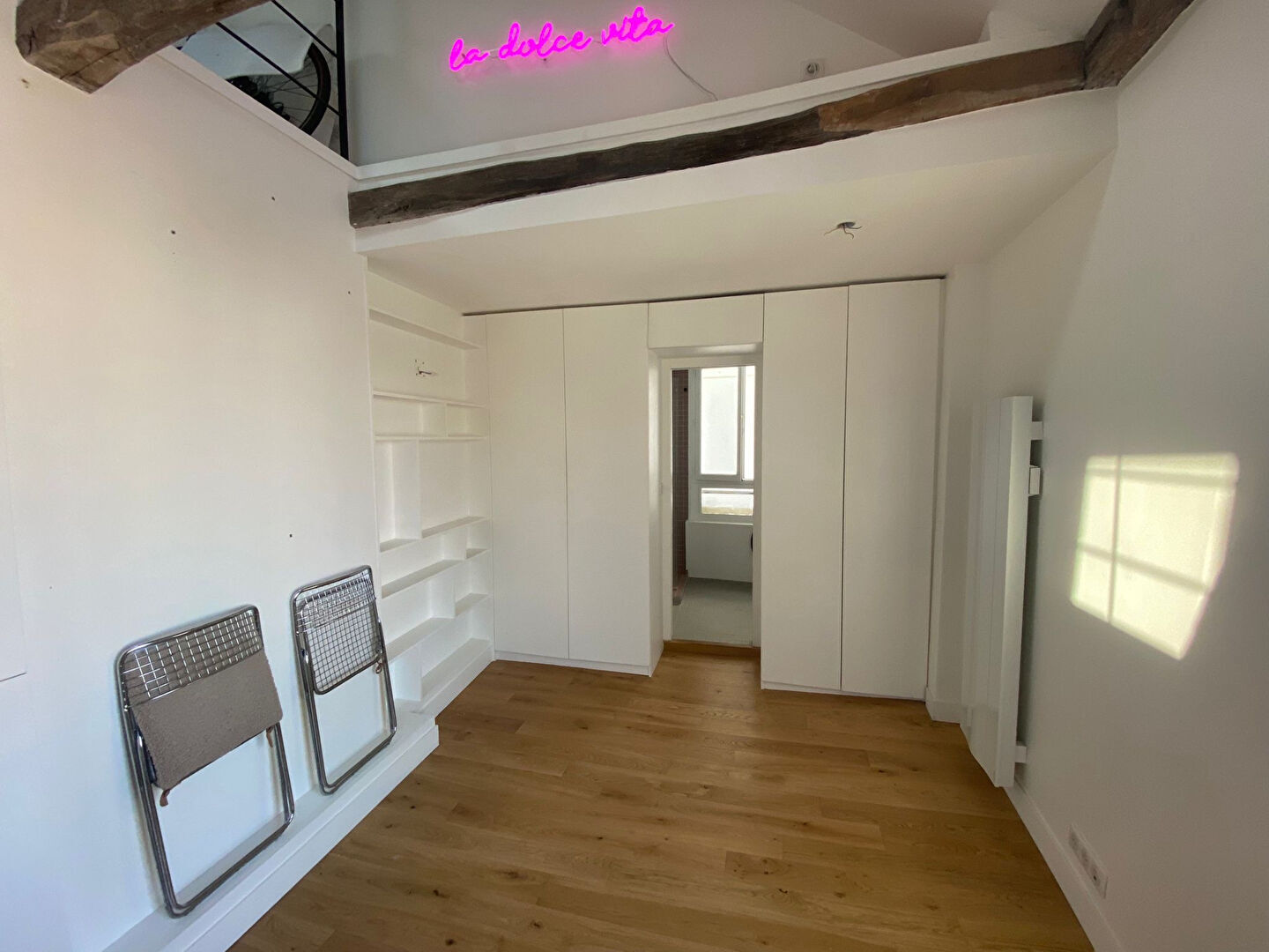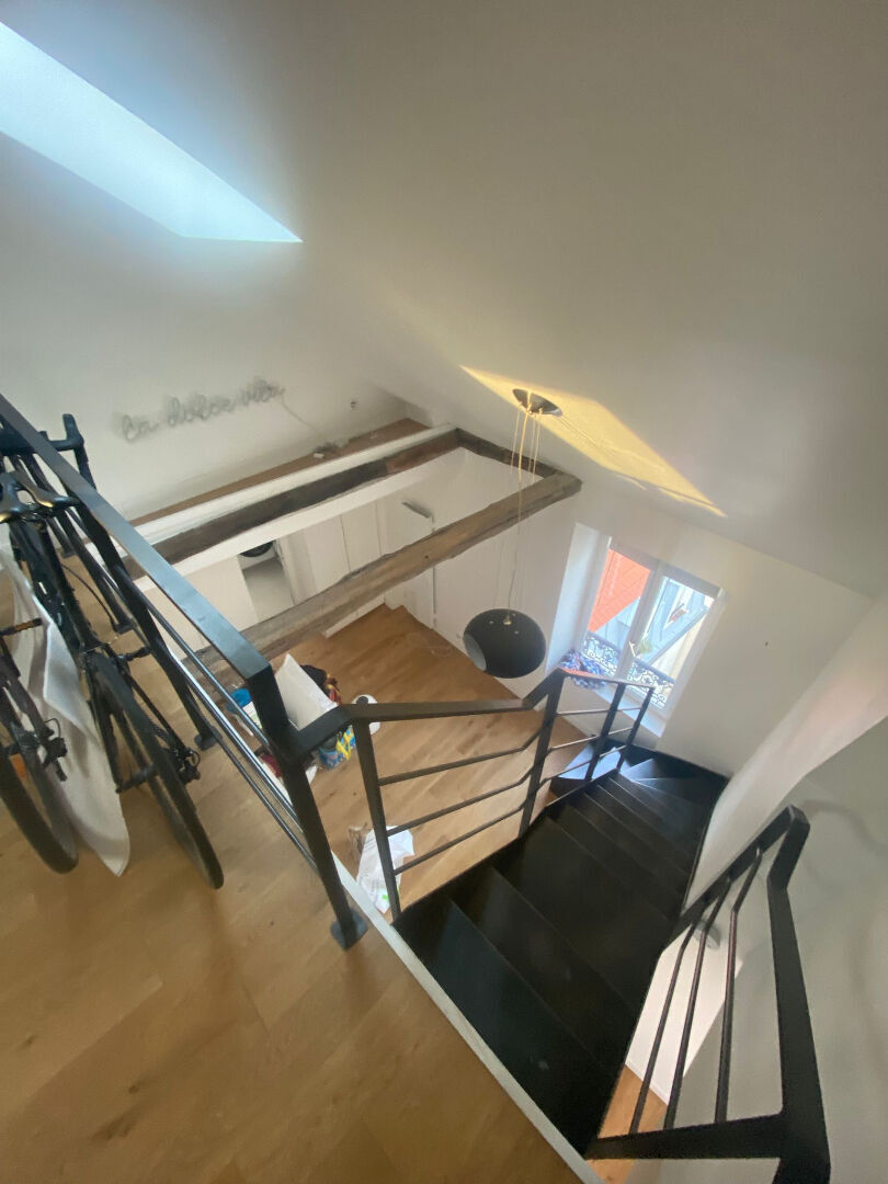 Paris 18, métro La Chapelle, Rue Philippe de Girard, dans immeuble ancien bien entretenu, au 5eme étage sans ascenseur, 2/3 pièces MEUBLE de 58,63m2 ( 39,01m2 loi carrez) composé au 5ème étage d'un séjour, une cuisine séparée ( equipée et aménagée), salle d'eau avec wc et au 6ème étage une pièce palière ( bureau, chambre d'appoint), une chambre avec rangements. Poutres apparentes, parquet au sol, beaucoup de cachet, état impeccable, très lumineux et calme. Chauffage et eau individuels electriques. Disponible de suite, honoraires d'agence TTC : 585,15 euros