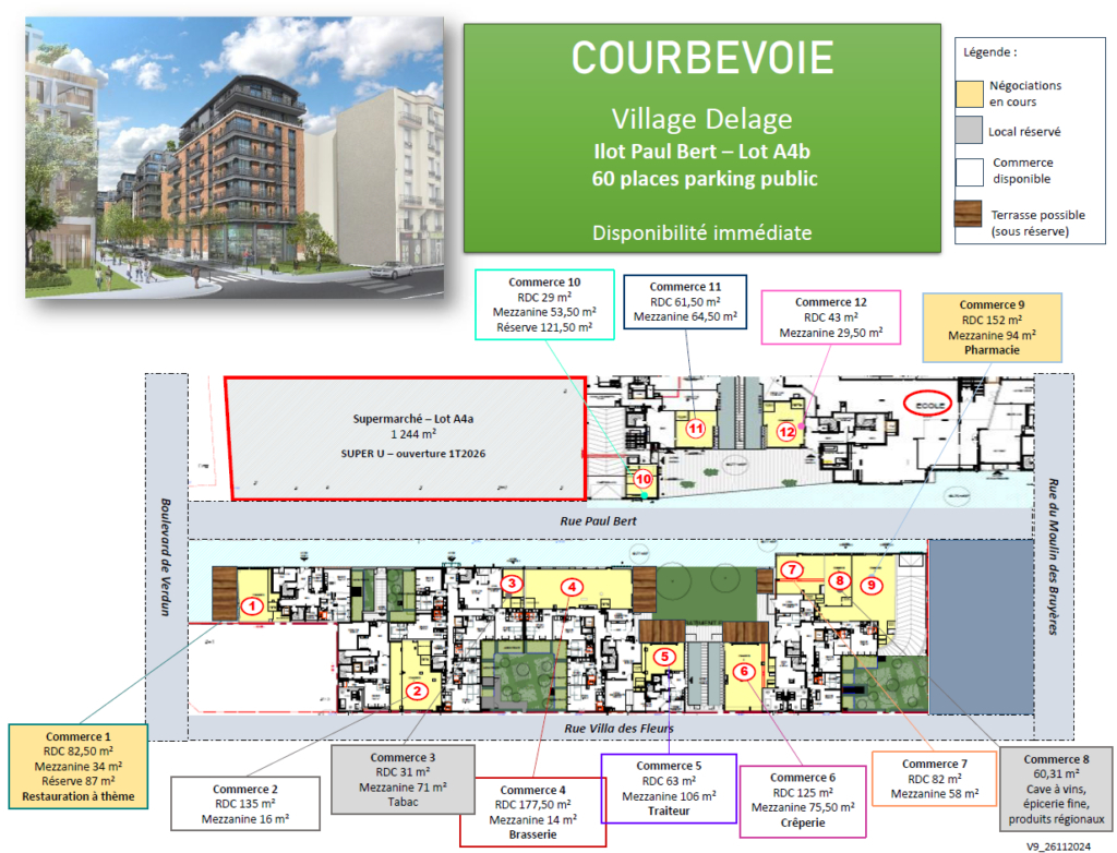 Courbevoie bécon, en plein coeur du nouvel éco quartier "village delage" (création 170000 m² de bureaux, 1000 logements, école, creche, parc...) Belle boutique d'une surface totale de 75 m² composée d'un rez de chaussé de 60 m² et d'une mezzanine de 15 m². vitrine de 5 m linéaire le local est neuf (livraison imminente), et livré brut, à aménager selon l'activité envisagée (possibilité d'installer une extraction (200 ) toutes activités possibles idéal pour un commerce de proximité, opticien, fleuriste, coiffeur, restauration, coffee shop, médical... information complémentaire, visites: frederic@odeonimmobilier.fr 0624728110 Frederic GODRON (EI) Agent Commercial - Numéro RSAC : - .