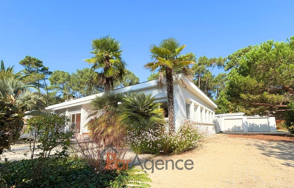 VILLA CONTEMPORAINE DE PLAIN-PIED A SAINT-PALAIS-SUR-MER, à l'orée de la forêt et à 650 m de la plage de la Grande Côte, villa contemporaine de plain-pied des années 50, d'une surface habitable d'environ 153 m2 comprenant : une pièce à vivre lumineuse avec cheminée insert, une cuisine séparée aménagée et équipée ouvrant sur une vaste terrasse et la piscine, un bureau, un couloir desservant 3 suites parentales avec salle d'eau et wc, 1 suite parentale avec salle de bains et wc, wc séparé. Chauffage au fioul. Non attenant, un garage double et buanderie. Face à la pisicine, une pergola bioclimatique. Le tout sur un terrain clos et boisé de 3392 m2. Les informations sur les risques auxquels ce bien est exposé sont disponibles sur le site Géorisques : www.georisques.gouv.fr. Honoraires agence à la charge de l'acquéreur. Prix 738 400EUR dont honoraires d'agence à la charge de l'acquéreur 4 % TTC soit 28 400EUR (710 000EUR hors honoraires). https://www.par-agence.fr/nos-honoraires.