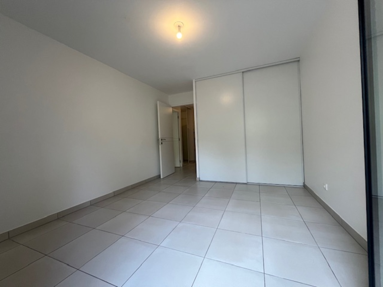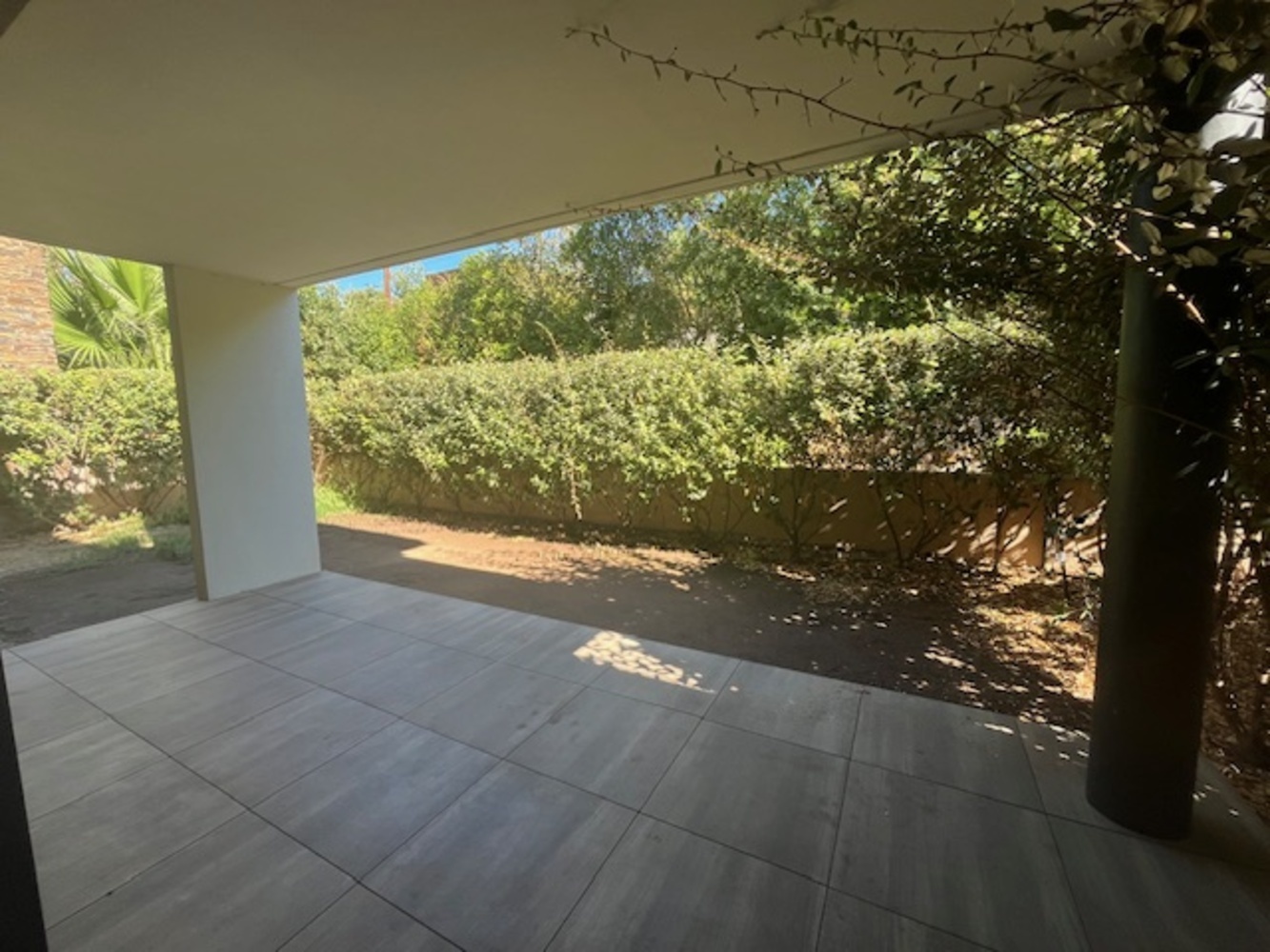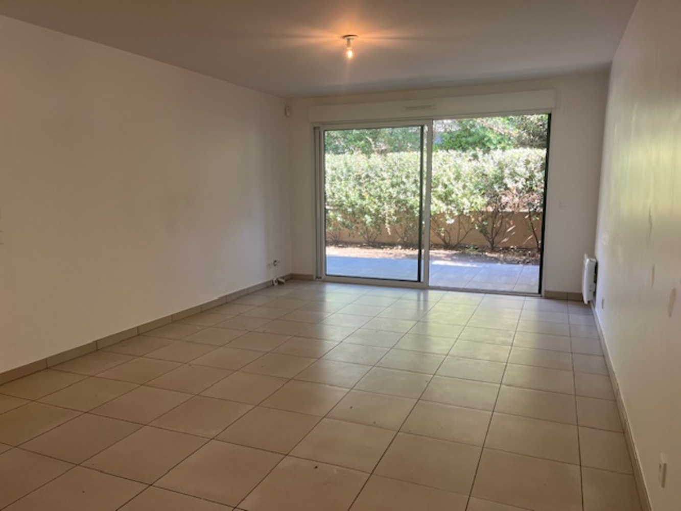 La chambre et le séjour s'ouvrent sur une belle terrasse de 12.28m² et d'un jardin de 45.89m²