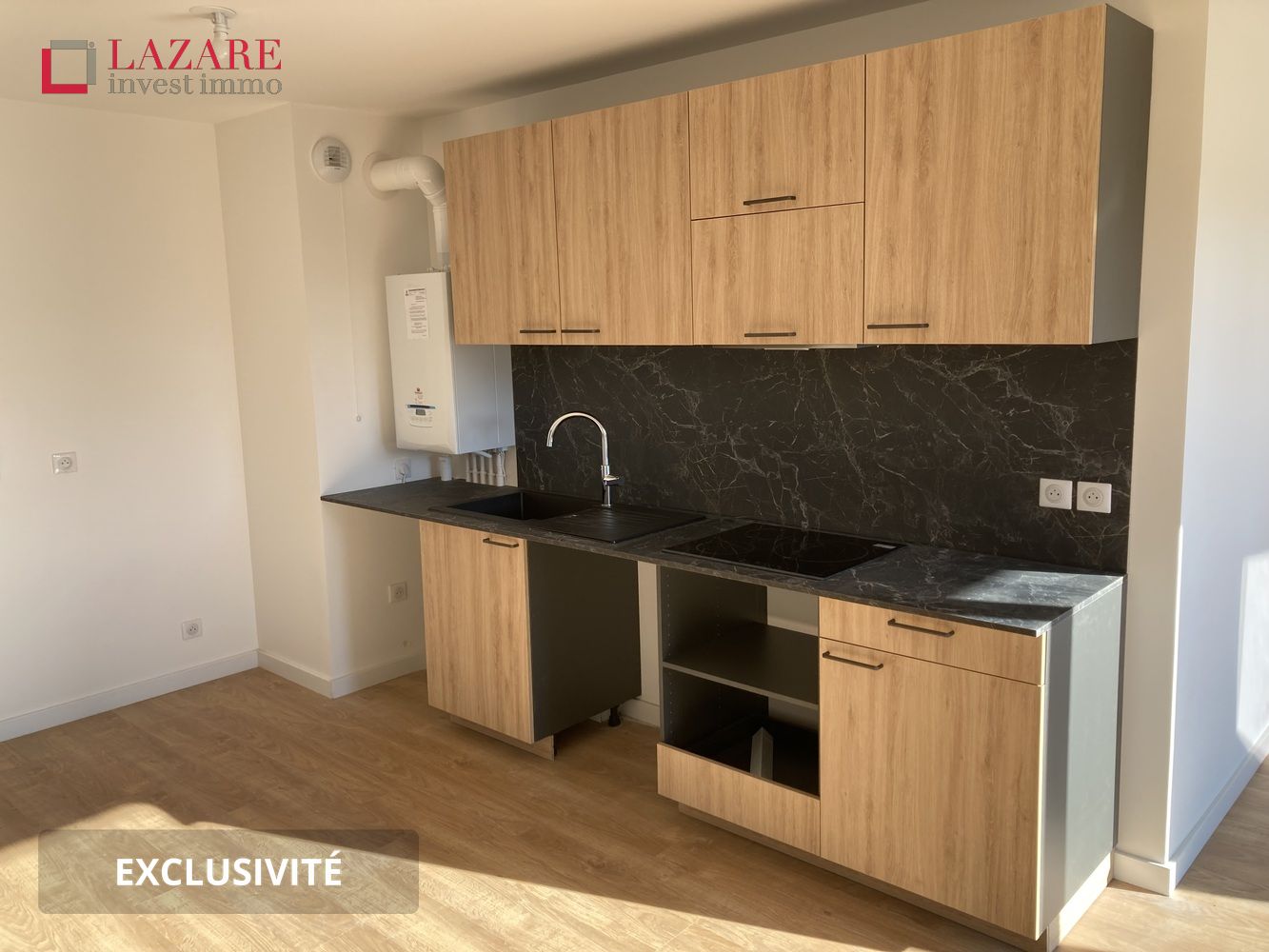 Ce T2 est composé d'un séjour avec cuisine ouverte aménagée et équipée ( plaque de cuisson à induction 3 feux, évier un bac avec égouttoir avec plan de travail et crédence, meuble sous évier, meubles hauts et bas, hotte, arrivées et évacuations pour LL/LV ), d'une chambre, d'une salle d'eau ( meuble vasque et vasque avec robinetterie mitigeuse, miroir avec éclairage, receveur de douche, compris douchette et flexible sur barre, radiateur sèche-serviettes, meuble de rangement ) avec WC.