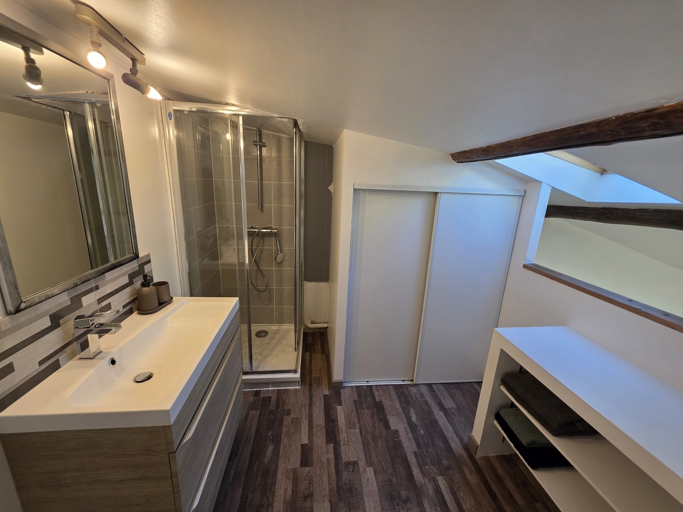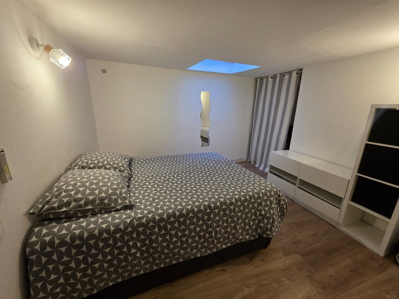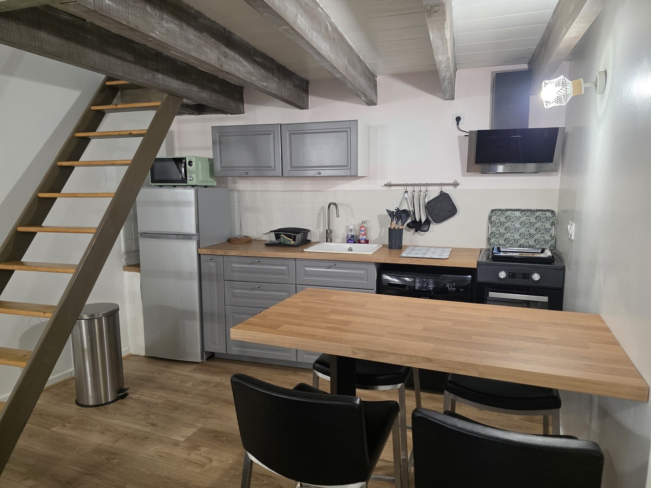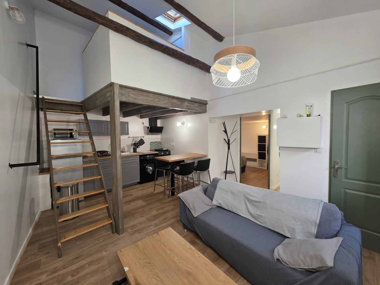 Un espace de vie qui propose une expérience intimiste et accueillante grâce à son aménagement soigné. Celui-ci offre une pièce principale avec une belle hauteur sous plafond, un coin cuisine aménagé et équipé, une chambre, ainsi qu'une salle d'eau sur la mezzanine et un wc séparé.