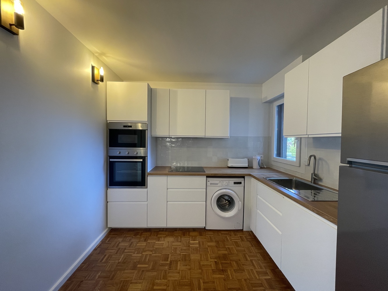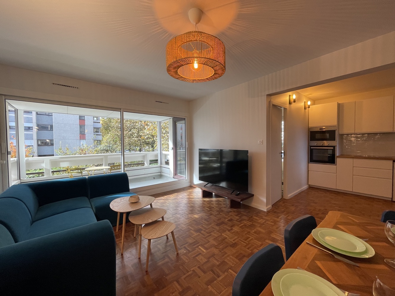 🍽️ La cuisine moderne est entièrement équipée (four, plaques, réfrigérateur, micro-ondes, lave-vaisselle, etc.) et s’ouvre sur un espace de vie convivial, idéal pour partager des moments entre colocataires.