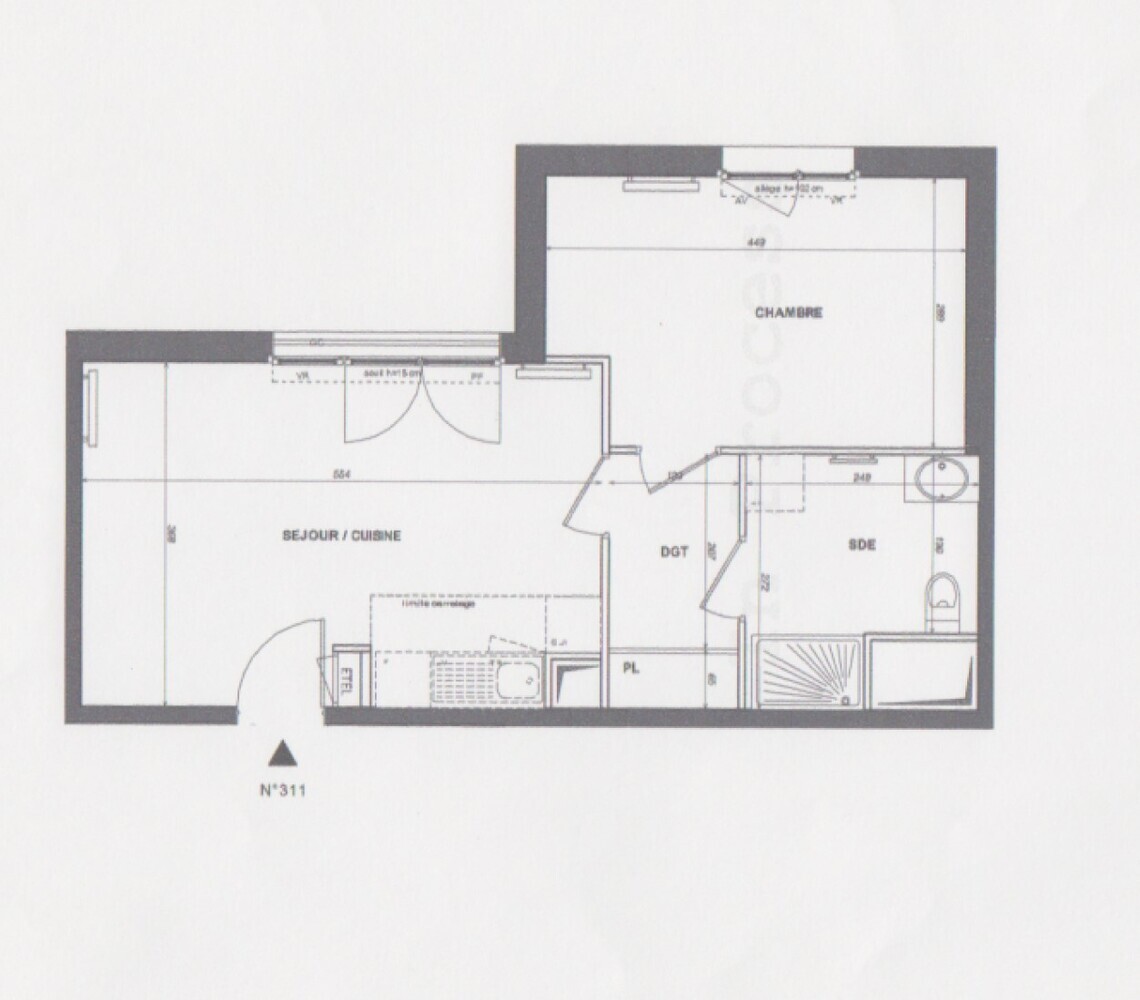 Dans une résidence neuve, au 1er étage avec ascenseur, un bel appartement de type 2 pièces (311) de 41.64m² comprenant un séjour avec une cuisine aménagée et équipée de plaques et hotte, une chambre, une salle d'eau avec wc, un dégagement avec placards.