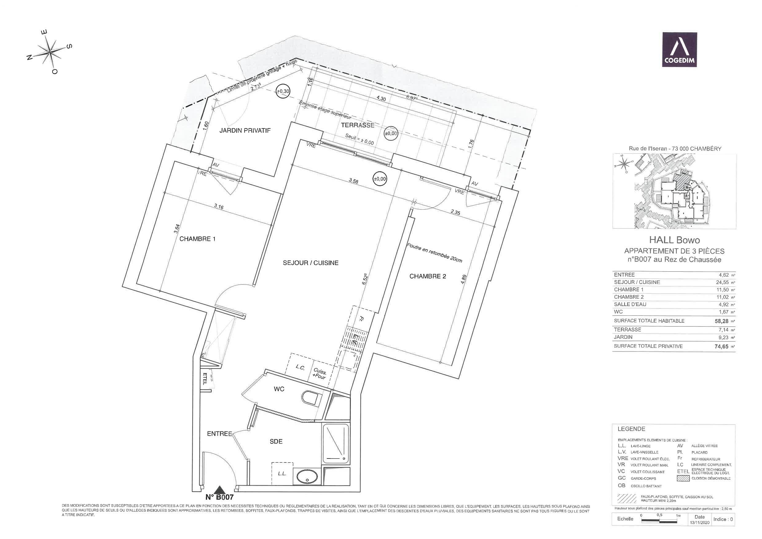 Résidence Héritage proche centre de Chambery, 3 pièces en rez de jardin, comprenant une entrée, une cuisine aménagée et équipée, salle d'eau avec vasque, miroir, douche, sèche serviette, wc séparé, séjour, 2 chambres, une terrasse, une place de stationnement, une cave.